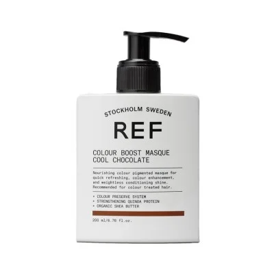 REF Colour Boost Masque Cool Chocolate (200 ml) ir tonējoša matu maska, kas paredzēta, lai atsvaidzinātu un uzturētu vēsu šokolādes brūnu matu toni. Šī maska palīdz neitralizēt siltos toņus, piešķirot matiem vēsāku un dziļāku brūnu nokrāsu, vienlaikus nodrošinot intensīvu mitrināšanu un barošanu. Tā padara matus mīkstus, gludus un spīdīgus, palīdzot saglabāt krāsas spilgtumu un dzīvīgumu starp krāsošanas reizēm. Maska ir piemērota mājas lietošanai un ir ideāli piemērota tiem, kas vēlas saglabāt vai atsvaidzināt savu šokolādes brūno matu toni.