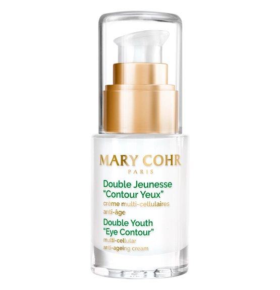 Mary Cohr Double Youth Eye Contour ir bagātināts ar Externnal Youth Hyaluronic Acid (augstas molekulmasas hialuronskābe), kas nodrošina intensīvu ādas mitrināšanu un komforta atjaunošanu acu kontūras zonā. Mango sviests papildus mitrina un baro ādu, padarot to maigu un elastīgu. Jeunesse Interne Multi-Cellular Concentrate (šūnu dzīves koncentrāts un Alaria ekstrakts) stimulē šūnu reģenerāciju un aizsargā šūnu DNS, palīdzot izlīdzināt grumbas un smalkās līnijas. Hidrolizēta DNS aizsargā un atjauno ādas struktūru, veicinot jauneklīgu izskatu.
