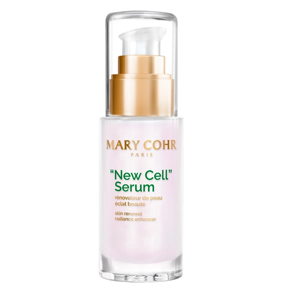 Mary Cohr New Cell Serum ir bagātināts ar Skin Renewal Complex, kas satur fitīnskābi un balto orhideju, kas nodrošina atmirušo šūnu nolobīšanu no epidermas virsmas un palīdz novērst poru aizsprostošanos. Fitīnskābe uztur ādas mitruma līdzsvaru, savukārt baltā orhideja veicina ādas izgaismošanu. Pink Reflect perlamutra pigmenti piešķir sejas ādai mirdzumu.