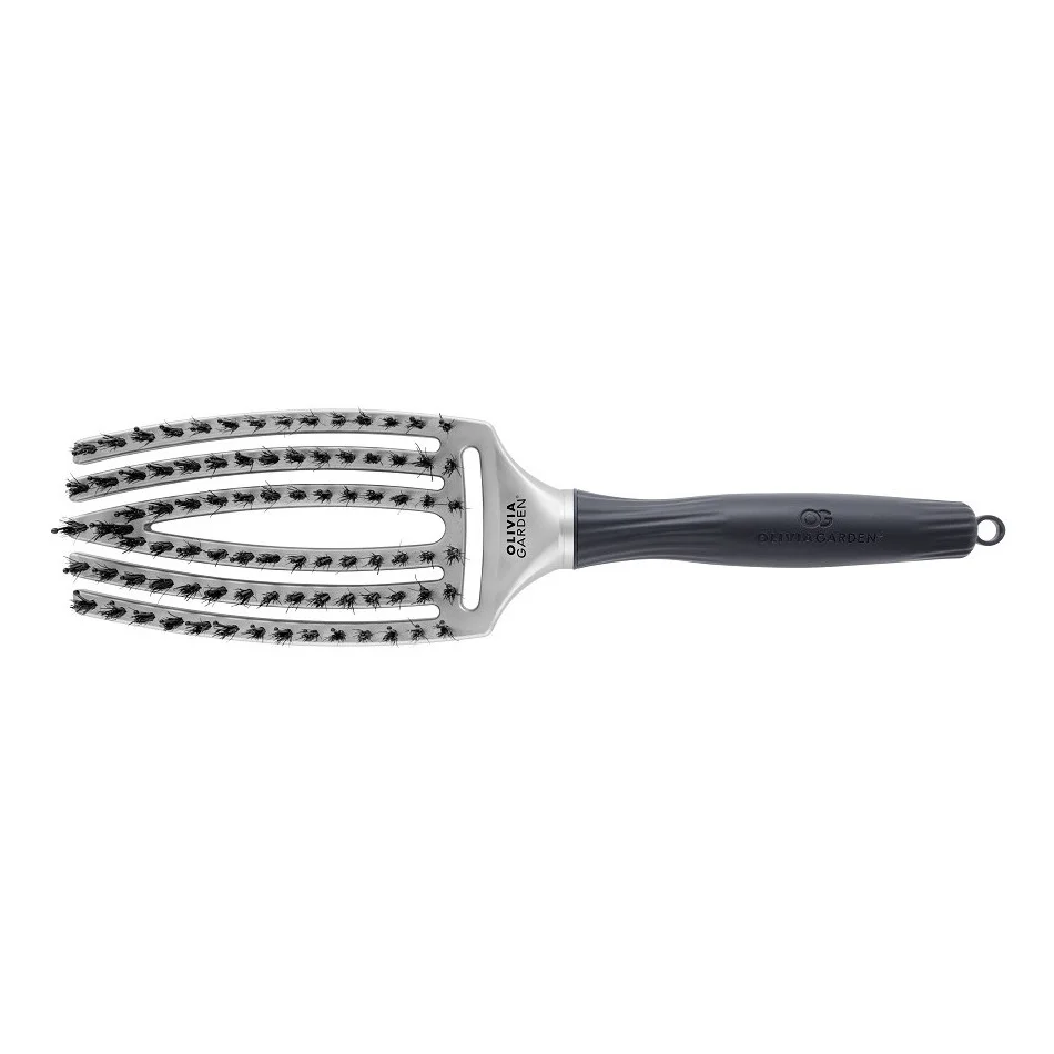 Olivia Garden Fingerbrush Combo Trinity ir izgatavota no mežacūku un neilona sariem, kas nodrošina matu spīdumu un maigu galvas ādas stimulāciju. Mežacūku sari padara matus spīdīgus, savukārt neilona sari maigi stimulē galvas ādu. Ionizētais plastmasas materiāls novērš statisko elektrību, nodrošinot gludus un spīdīgus matus.