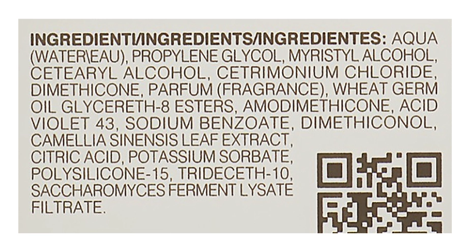 Полный состав: вода, цетеариловый спирт, хлорид бегентримония, цетиловый спирт, гидролизованный пшеничный протеин, гидролизованный кератин, пантенол, парфюм (ароматизатор), лимонная кислота, базовый фиолетовый 2, феноксиэтанол, этилгексилглицерин, лимонен, линалоол, гексилциннамал, бензилсалицилат.