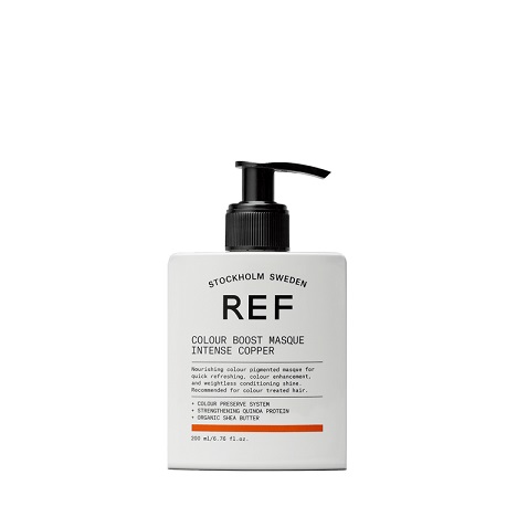 REF Color Boost Masque Intense Copper — это глубоко питательная и усиливающая цвет маска для волос, специально разработанная для волос медного оттенка. Эта интенсивная маска помогает поддерживать и освежать медные и теплые тона между сеансами окрашивания, обеспечивая при этом глубокое увлажнение и защиту от выцветания. Обогащенная натуральными ингредиентами, такими как протеины пшеницы и аргановое масло, маска укрепляет структуру волос, делая их мягкими, блестящими и гибкими. Идеально подходит для окрашенных волос, эта маска помогает дольше сохранять интенсивность цвета и блеск.